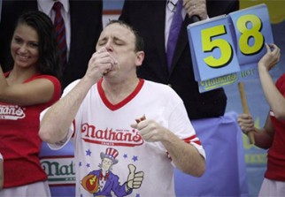 Joey "Jaws" ("mâchoires") Chestnut, qui devait repartir vendredi avec 10.000 dollars, a lui engrangé 31 records mondiaux, dont ceux de plus gros mangeur de glace (7 litres de glace à la vanille en 6 minutes) et d'œufs durs (141 en 8 minutes.)