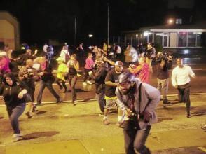 Elle a commencé à disperser la foule près de trois heures avant l'entrée en vigueur du couvre-feu à minuit (05H00 GMT). Le face-à-face se poursuivait dans la nuit dans le quartier de St Louis. Des centaines de personnes s'étaient rassemblées plus tôt dans la journée dans une église de Ferguson pour demander justice après la mort de Michael Brown, qui a provoqué une semaine de manifestations pacifiques, d'émeutes sporadiques et l'instauration d'un couvre-feu samedi soir, prolongé dimanche.