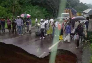 «On est en train d'abattre les arbres pour créer un pont piéton afin que les gens commencent à traverser à pied», a expliqué Martial Missimikim, responsable d'une ONG de sécurité routière, Securoute. De nombreux voyageurs et automobilistes étaient bloqués de part et d'autre de la route, attendant le retour à la normale, a-t-il rapporté.