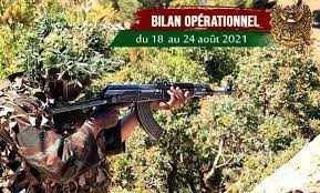 "Dans le cadre de leurs nobles missions de défense et de sécurisation du territoire national contre toute forme de menaces, des détachements et des unités de l'Armée nationale populaire ont mené, du 18 au 24 août 2021, de multiples opérations qui témoignent de l’engagement infaillible de nos Forces armées à préserver la quiétude et la sécurité dans notre pays", précise la même source.