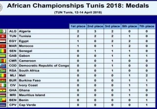 Les médailles d'or algériennes ont été décrochées par Abderrahmane Benamadi (-90kg) et Kaouthar Ouallal (-78 kg), alors que les médailles d'argent ont été l'œuvres de Lyès Bouyacoub (-100 kg), Souad Bellakehal (-70 kg) et Sonia Asselah (+78 kg).